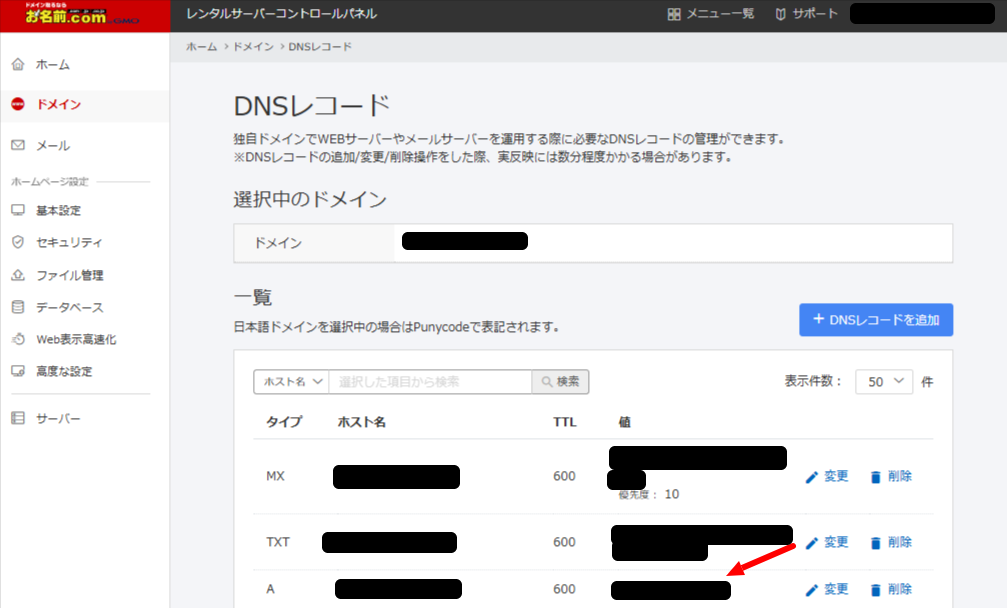 - お名前.comのDNS設定でサブドメインをAレコード登録