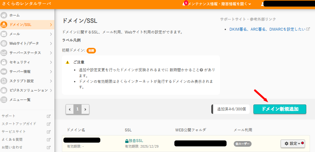 必ず「ドメイン/SSL設定」から該当サブドメインを選び、Let’s Encrypt(無料SSL)を有効化してください。